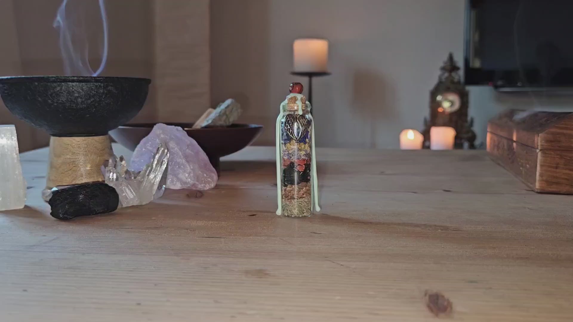 Mit sorgfältig ausgewählten Kristallen, Kräutern und einem intuitiven Zauberspruch ist dieses Wunschglas ein liebevoller Begleiter in dunkleren Zeiten – und ein kraftvolles Ritualobjekt für emotionale Entlastung.